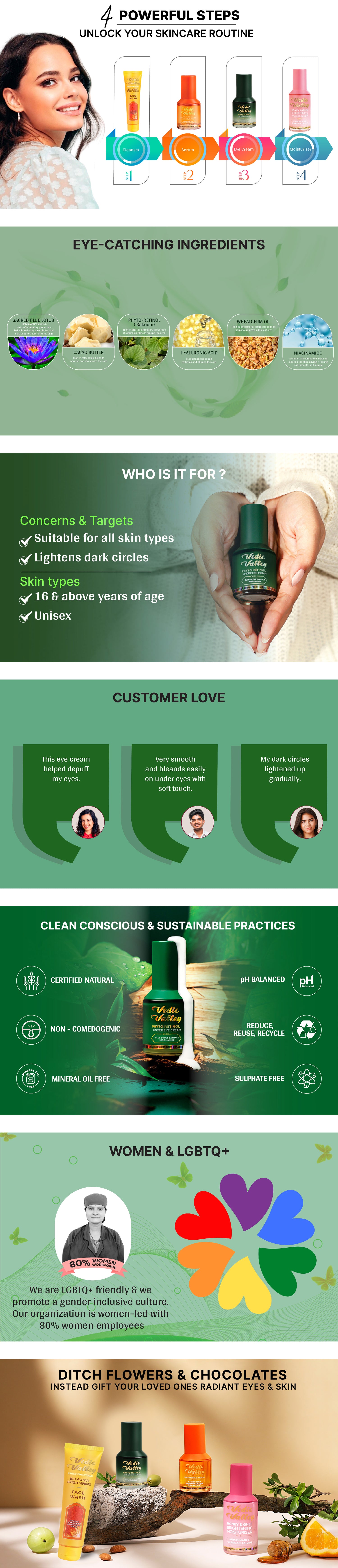 The Eye Cream is a tiny touch of magic. The transformative essence of Blue Lotus extract will awaken and illuminate the windows to your soul. Crafted with a blend of organic ingredients such as Phyto-Retinol (Bakuchi), Cacao seed butter, Wheatgerm & Almond kernel Oil, that helps to reduce the appearance of dark circles and fine lines. It also contains Hyaluronic acid and Provitamin B5 that help to hydrate and boost collagen to improve skin elasticity around the eyes. The eye cream is lightweight, non-sticky, and absorbs quickly into the skin. Wake up to eyes that are brighter, smoother, and more radiant.