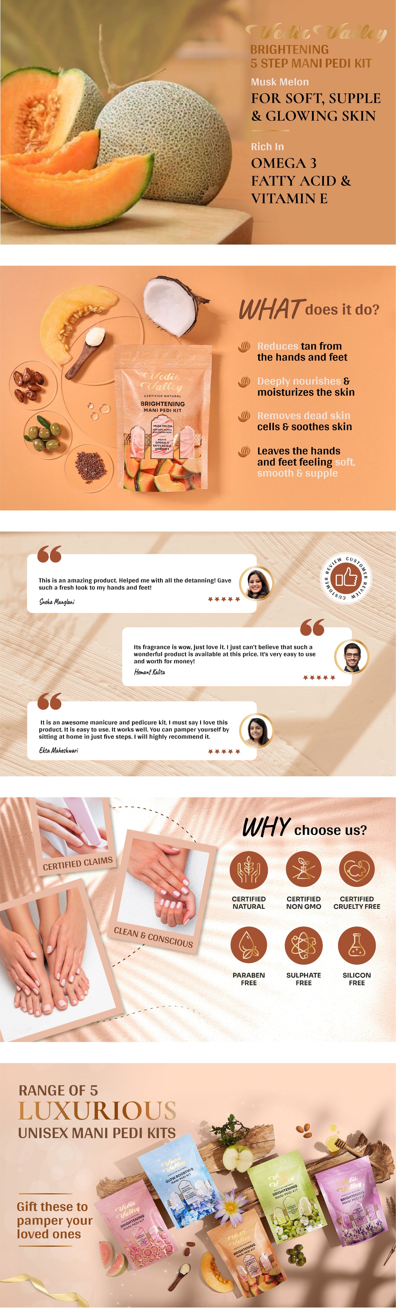 Vedic Valley's 5-step Certified Natural & Vegan Detan Mani-pedi Kit Is The Perfect Way To Get Salon-quality Results At Home. It Is A Premium, Monodose Kit That Will Have You Saying Goodbye To Your Tan And Hello To Your Glow.