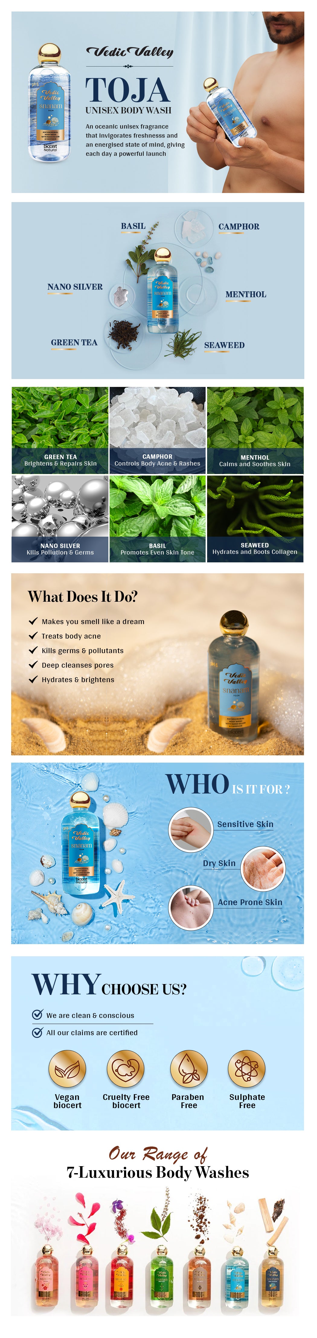 This nourishing body wash is imbued with holy water from the Triveni Sangam, a confluence of Ganga, Yamuna & Saraswati. Sourced from the cradle of divinity, this precious elixir brings a calming bliss in every shower. Enriched with the hydrous properties of water, this product gently removes excessive oil from the skin pores and helps retain natural moisture.