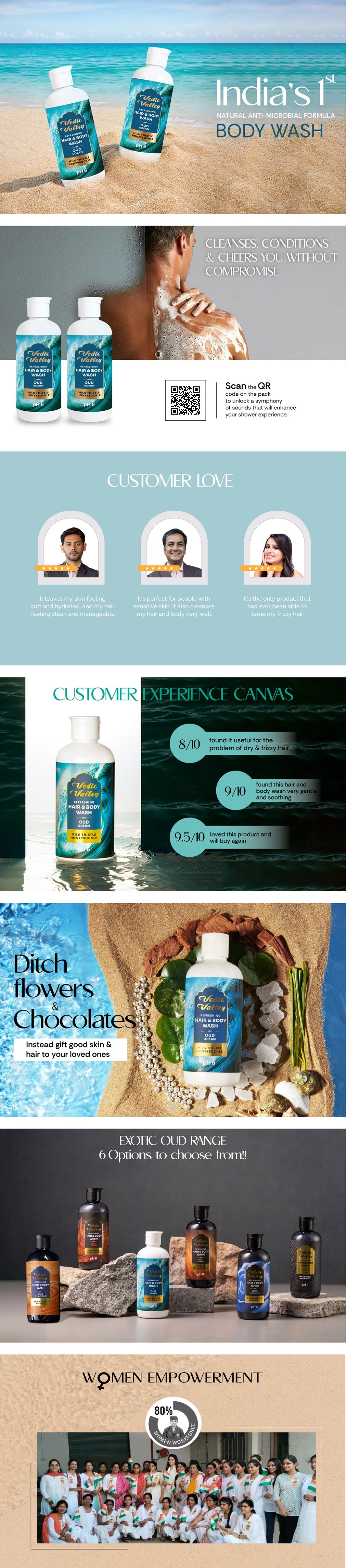 Milk Thistle due to its antioxidant & anti-inflammatory properties help to delay premature aging, reduce inflammation and soothe irritated skin. Honeysuckle rich in vitamins C & E, boosts a brighter skin tone & promotes hair growth. This hair and body wash with Gotu Kola, Nagarmotha, and Ginseng Oil stimulates hair follicles for shiny and healthy hair, reducing hair fall over time, and also soothes the skin, deep cleanses the pores, and promotes even skin tone.