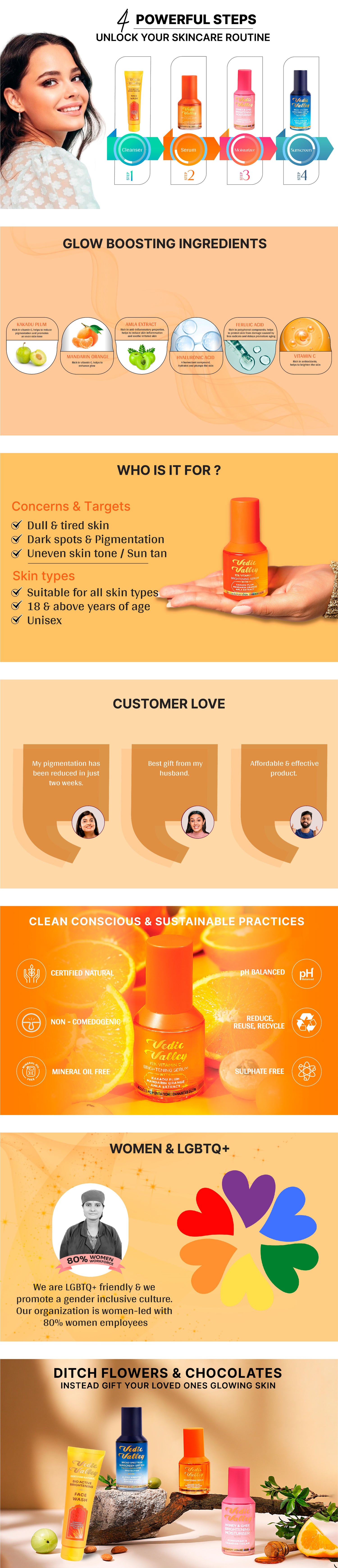 Kakadu plum, rich in the highest amount of vitamin C in the world with up to 97% of daily value per 100 grams, helps to reduce pigmentation, dark spots and promote an even skin tone. Mandarin orange, rich in vitamin C with up to 26% of daily value per 100 grams, helps to brighten the skin. The blend of certified natural ingredients such as Amla extract, hyaluronic & ferulic acid, helps to hydrate, nourish and soothe irritated skin. This ultrafine, lightweight, and non-sticky brightening serum absorbs quickly into the skin, leaving it soft, smooth, and supple.